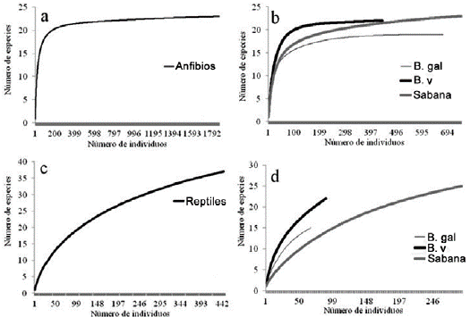 La completitud del muestreo para anfibios fue alta, en todos los casos la curva tuvo comportamiento asintótico (Fig. 2a) y se registraron entre el 95% (Jack1) y el 100% (Chao 1) de las especies estimadas (Fig. 2b). Respecto a los reptiles, los valores de completitud fueron menores y se registraron entre 74% (Jack1) y el 76% (Chao 1) de las especies esperadas; la curva de acumulación para reptiles presentó una tendencia a la estabilización (Fig. 2c). Los valores de completitud más altos para este grupo se obtuvieron en el bosque de galería y en la sabana y en ningún caso la curva de acumulación de especies alcanzó la assíntota (Fig. 2d).