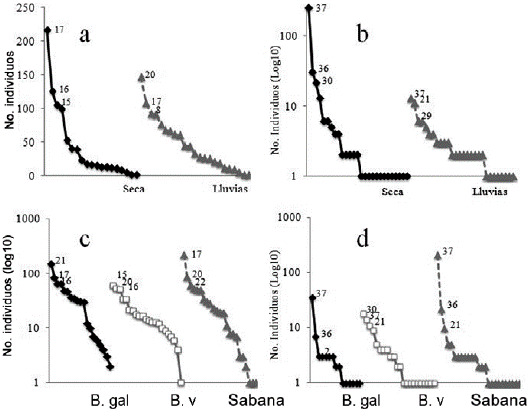 Figura 3: Curvas de rango abundancia para anfibios y reptiles en las diferentes coberturas en sabanas inundables de la Orinoquia colombiana. a. Anfibios en épocas seca y lluvias, b. Reptiles en épocas seca y lluvias, c. Anfibios por coberturas, d. Reptiles por coberturas. B. gal= Bosque de galería, B. v= Bosque de vega. Los números corresponden a las especies de anfibios y reptiles de la tabla 1.