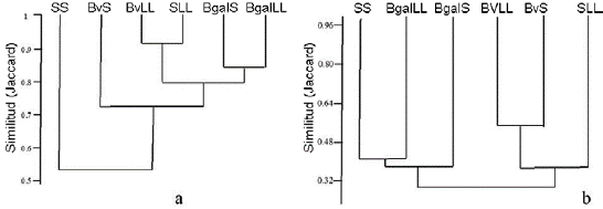 Figura 4: Similitud en la composición de especies de anfibios y reptiles en diferentes coberturas y épocas climáticas en sabanas inundables de la Orinoquia colombiana. a. anfibios, b. reptiles. SS=Sabana en época seca, SLL=Sabana en época de lluvias, BvS= Bosque de vega en época seca, BvLL= Bosque de vega en época de lluvias, Bga1S= Bosque de galería en época seca, Bga1LL= Bosque de galería en época de lluvias.