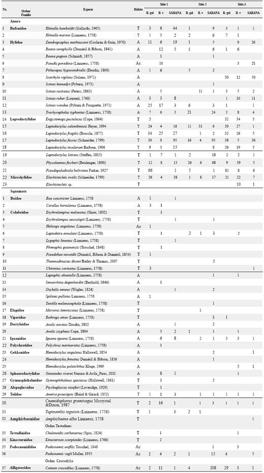 En el sitio uno se presentó la mayor riqueza con 47 especies (20 de anfibios y 27 de reptiles), seguido por el sitio dos con 38 especies (18 de anfibios y 20 de reptiles) y el sitio tres con 36 especies (20 de anfibios y 16 de reptiles) (Tabla 1). En cuanto a los tipos de cobertura, las sabanas presentaron la mayor riqueza con 23 especies de anfibios (100%) y 25 de reptiles (67,5%), seguidas por los bosques de vega con 22 especies de anfibios (95,6%) y 22 de reptiles (59,4%), y los bosques de galería con 19 especies de anfibios (82,6%) y quince de reptiles (40,5%) (Fig. 2c, d). En época seca se registraron 19 especies de anfibios y 27 de reptiles, de estas especies de reptiles, nueve no se registraron en época de lluvias. Para la época de lluvias se registraron 23 especies de anfibios y 28 de reptiles, de las cuales catorce especies no fueron registradas en época seca (Tabla 1).