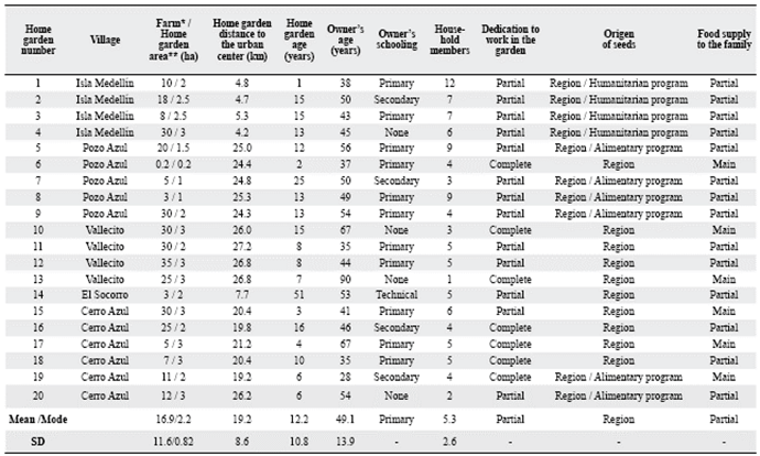 Families were comprised of 1-12 members (X = 5.3; SD = 2.6), however only 1-5 people per family worked in the gardens. Farmers' ages varied between 28-90 years (X = 49.1; SD = 13.9), and the most frequent level of schooling was primary education (Table 1). Only 35% of the owners worked exclusively in the home gardens, and the others reported carrying out complementary economic activities. Likewise, the income and food supply of only 30% of the families were primarily derived from their home gardens (Table 1).