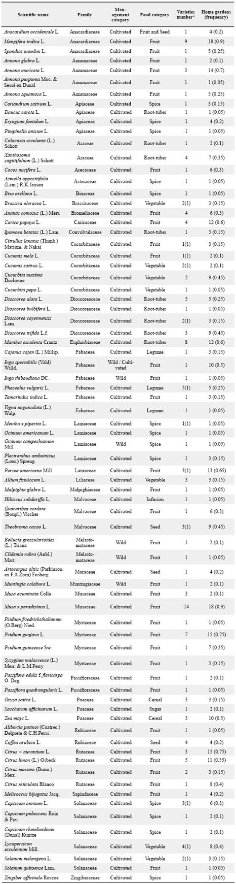 In total 75 species in 32 families were recorded (Appendix 1). Of these, 69 were cultivated, five were wild and one (Inga spectabilis (Vahl) Willd.) was found wild and cultivated. The richest families were Fabaceae and Solanaceae (8% of the total number of species each one), followed by Cucurbitaceae (6.7%) as well as Annonaceae, Apiaceae, Dioscoreaceae, Lamiaceae, Myrtaceae and Rutaceae (5.3% each one).