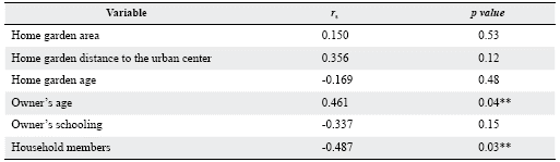 Correlations between plant species richness (the number of different species used as food in the home garden) and owner's age and schooling (from the most basic to the most advanced, primary, secondary and technical), household members, and home garden age (owner tenure time), area and distance to the urban center were assessed using Spearman's rank correlation coefficient.