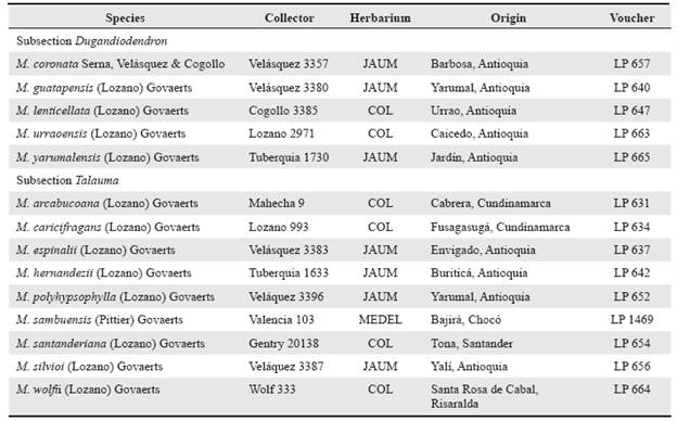 According to the most recent classification of neotropical species based on morphological and molecular studies, Magnolioideae comprises only the genus Magnolia L. and the other genera are currently considered sections and subsections of this genus (Figlar & Nooteboom 2004). Currently, all the Colombian species are included in Section Talauma (Figlar & Nooteboom 2004). However, these species belong to two different subsections based on morphological characters: Talauma Juss. and Dugandiodendron Lozano (Figlar & Nooteboom 2004, Lozano 1975, 1983, 1994).