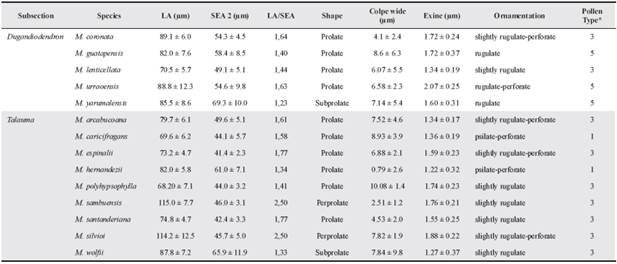 Later, Lozano (1994) described pollen grains of Magnoliaceae as ellipsoidal with rounded ends and classified the species based on Praglowski's types (1974). Magnolia calophylla (Lozano) Govaerts, M. caricifragans and M. santanderiana, were described as Type 2. Pollen grains of M. mahechae and M. urraoense were classified as Type 4, while Magnolia argyrothricha (Lozano) Govaerts, Magnolia colombiana (Little) Govaerts and M. yarumalensis grains belonged to Type 5. Our results concur with those of Lozano (1983, 1994) for M. yarumalensis but not for M. caricifragans (Type 2 in Lozano vs. Type 1 in this work), M. santanderiana (Type 2 vs. Type 3) and M. urraoensis (Type 4 vs. Type 5) (Table 2). These differences can be explained by the maturity level of grains, considering that Lozano (1983) observed immature pollen.