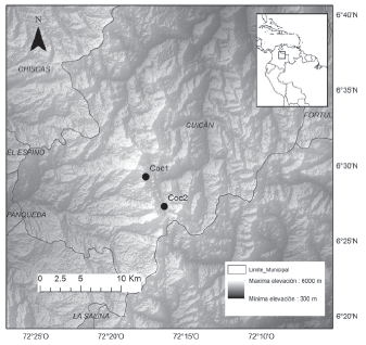 Figura 1: Mapa de la zona de estudio con los sitios de los dos núcleos marcados por círculos negros. El área de estudio se encuentra ubicada en la parte Oriental de la Sierra Nevada del Cocuy (Colombia).