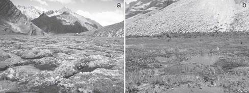Figura 2: Fotografías de las áreas donde se colectaron los núcleos en el PNN Cocuy. a. corresponde al núcleo COC1 en el Valle de los Cojines y b. corresponde al núcleo COC2 en la laguna de Los Patos (ver Tabla 1).