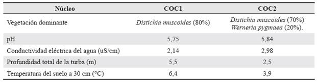 Tabla 1: Vegetación y características químicas del agua y la turba en los núcleos COC1 y COC2.
