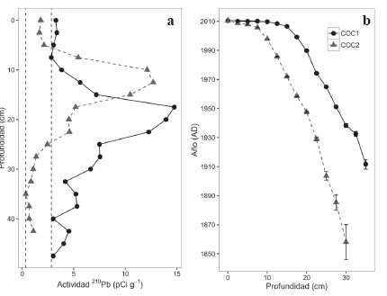 Figura 3: a. Cambio en la actividad de 210Pb con la profundidad. Las líneas punteadas verticales corresponden a los puntos límites de 210Pb soportado por el sustrato para cada uno de los núcleos. b. Curvas de acumulación de turba usando decaimiento de 210Pb. Barras de error corresponden a incertidumbre de la datación (Wieder 2001).