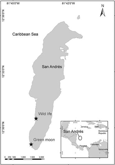 Figure 1: San Andrés Island with sampling sites. Wild Life (12°30’30” North; 81°43’45” West). Green Moon (12°29 07” North; 81°44′01” West).