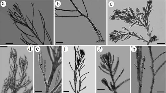 Thallus delicate (2.5-3 mm high) attached to the substrate by multicellular rhizoids (Fig. 2f). Main branch erect, uniseriate, with basal cells up to 65 µm diameter, 130 µm long, tapering towards the apex (Fig. 2g). Cells in the middle part of the axis 34 µm in diameter, 62 µm in length, and at the apex, 25-30 µm in diameter, 30 µm in length. The main axis bears alternately decumbent branchlets, which are 500 to 600 µm long and have 1-2 elliptical papilliform cells (12 x 18 µm) located at distal cells of each branch (Fig. 2h). No reproductive structures were observed. Specimens epiphytic on Dictyota spp.