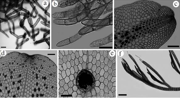 Taenioma nanum: f. Upper portion of blades with two monosiphonous “hairs” at apex. Scale bar: a, c, d, e and f = 200 µm; b = 100 µm.