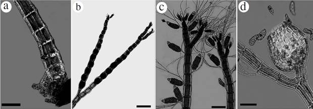 Thallus filamentous, erect, delicate (Fig. 2a), up to 5 cm high; uniseriate main axes ecorticate throughout, attached to the substrate by descending multicellular rhizoidal filaments (Fig. 2b). Main axis 50-110 µm in diameter, tapering distally; cells 180-250 µm long (Fig. 2a). Branchlets alternate and radial, composed of cells 15-20 µm in diameter and up to 125 µm long. Apical cells of secondary branchlets are longer and obtuse, 4 µm in diameter and 7.5 µm in length, and basal cell 50 µm diameter and 120 µm in length. Basal portion formed by multicellular rhizoids with haptera (Fig. 2b). No reproductive structures were observed. All specimens were found growing as epiphytes on Canistrocarpus cervicornis (Kützing) De Paula et De Clerck, Dictyota pulchella Hörnig et Schnetter, Lobophora variegata (J.V. Lamouroux) Womersley ex E.C. Oliveira, and Halimeda opuntia (Linnaeus) J.V. Lamouroux.
