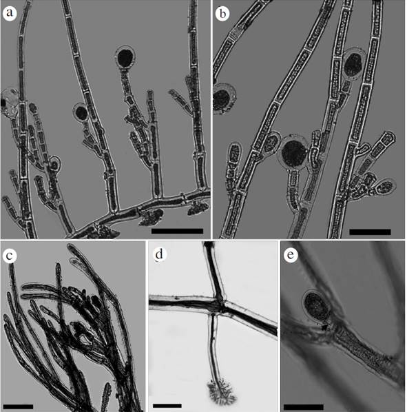 Monosporus indicus: c. Detail of distal branchlets portion, d. Prostrate axis and unicellular rhizoid, e. Oval one-celled propagules attached by triangular pedicel (arrowhead). Scale bar: a and e = 100 µm; b = 50 µm; c and d = 200 µm.