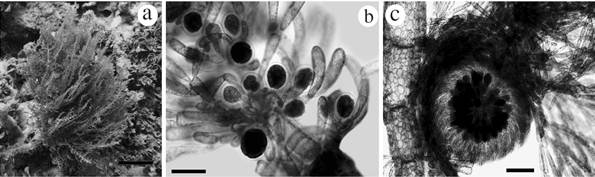 Wrangelia gordoniae: a. Habit in situ, b. Whorl branchlets bearing clusters of tetraedric tetrasporangia, c. Mature cystocarp. Scale bar: a = 4 cm; b = 100 µm; c = 200 µm.