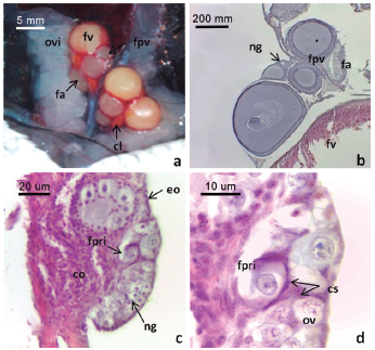 a. Vista general del sistema reproductor en etapa reproductiva. b. Sección histológica del ovario en etapa reproductiva. c. Nido germinal. d. Detalle de un folículo primordial en etapas iniciales de la foliculogénesis. Convenciones: cl: cuerpo lúteo, co: corteza ovárica, cs: células de soporte, eo: epitelio ovárico, fa: folículo atrésico, fpri: folículo primordial, fpv: folículo previtelogénico, fv: folículo vitelogénico, ng: nido germinal, o: ovogonias, ov: ovocito primario, ovi: oviducto. Tinción: H-E.