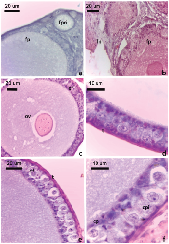 a. Folículo primario estadio IIa, b. Folículos primarios estadio IIb, c. Folículo en estadio IIIa, d. Detalle del epitelio folicular de un folículo en estadio IIIb. e. Detalle del epitelio folicular de un folículo en estadio IV. f. Detalle de las células piriformes. Obsérvese la prolongación de la porción apical de la célula piriforme en contacto con la membrana plasmática del ovocito (flecha). Convenciones: cp: células pequeñas, cpi: células piriformes, ef: epitelio folicular, fp: folículo primario, fpri: folículo primordial, fpv: folículo previtelogénico, ov: ovocito, t: teca. Tinción H-E.