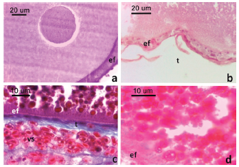 a. Folículo en estadio V. Obsérvese los gránulos en la región cortical del citoplasma (flecha). b. Detalle del epitelio folicular de un folículo en estadio VI. c. Detalle del epitelio folicular de un folículo en estadio VII. d. Detalle la región cortical del ovocito de un folículo en estadio VIII. Obsérvese las plaquetas vitelinas. Convenciones: ef: epitelio folicular, pv: plaquetas vitelinas, t: teca, vs: vaso sanguíneo. Tinción H-E (a., b. y d.) y tricrómica de Gomori (c.).