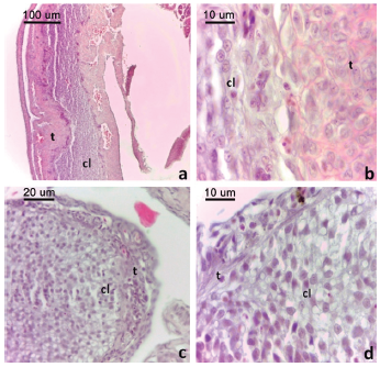 Se observaron cuerpos lúteos en estadio III y IV, en dos hembras que poseían huevos oviductales. Cuerpos lúteos en estadio III (Fig. 4a) presentaron estructura compacta y contorno irregular. Se observó una zona interna de células luteínicas de forma oval y una zona externa de células tecales hipertrofiadas, inmersas en una matriz extracelular acidófila, y abundantes vasos sanguíneos (Fig. 4b). Estos fueron registrados en una hembra colectada en diciembre con tres embriones en estadio de gástrula inicial (E. 11 D-H).