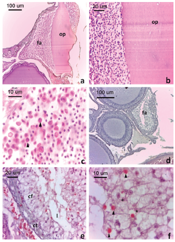 a. Folículo en atresia temprana. Obsérvese la desorganización e hipertrofia de las células foliculares y rotura de la membrana plasmática del ovocito. b. Detalle las células foliculares invadiendo y fagocitando el citoplasma (flecha). c. Detalle de la invasión de células sanguíneas en el folículo atrésico (flecha indica eosinófilos). d. Folículo en atresia avanzada. e. Detalle de folículo atrésico. Obsérvese la reabsorción completa del ovoplasma. f. Detalle de las células foliculares de un folículo atrésico avanzado, obsérvese gránulos acidófilos (flecha) e inclusiones basófilas (asteriscos). Convenciones: cf: células foliculares, ct: células tecales, fa: folículo atrésico, l: lumen, op: ovoplasma. Tinción H-E.