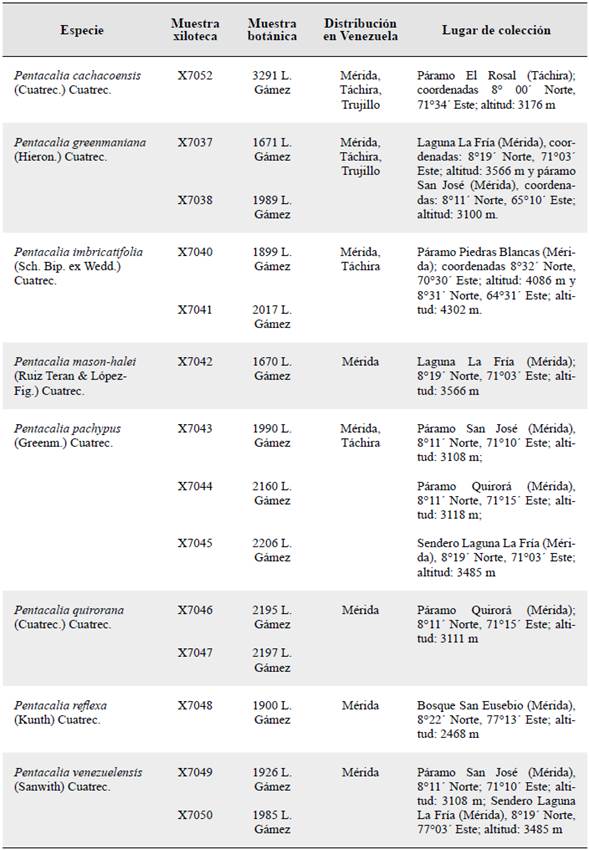 El material de estudio está representado por muestras de madera de ocho especies de Pentacalia colectadas en los estados venezolanos de Mérida y Táchira: siete especies fueron colectadas en zonas de páramo y una especie en selva nublada (Tabla 1). El criterio de selección fue por ser las especies del género más comunes dentro de los páramos de los estados mencionados además de incluir una especie de la zona de vida selva nublada andina por ser un ambiente contrastante con respecto al área de mayor abundancia de especies de este género, como corresponde a los páramos. Todas las especies estudiadas son de porte arbustivo. Se colectaron muestras de uno a tres individuos por especie, dependiendo de su abundancia en la zona de colección, tomándolas en la base del tallo de mayor grosor para cada individuo. Cada muestra de leño fue ingresada a la colección permanente de la Xiloteca MERw (Laboratorio de Anatomía de Maderas, Universidad de Los Andes) y su respectiva muestra botánica fue incorporada al Herbario MER “Carlos Liscano” de la Universidad de Los Andes.