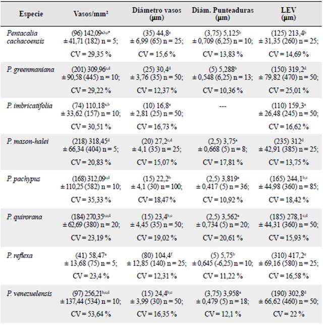 Tabla 2: Características cuantitativas de vasos en las especies de Pentacalia: vasos/mm2, diámetro de vasos, diámetro de punteaduras y longitud de elementos de los vasos (LEV) (mínimo, promedio, desviación, máximo, número de mediciones, coeficiente de variación).