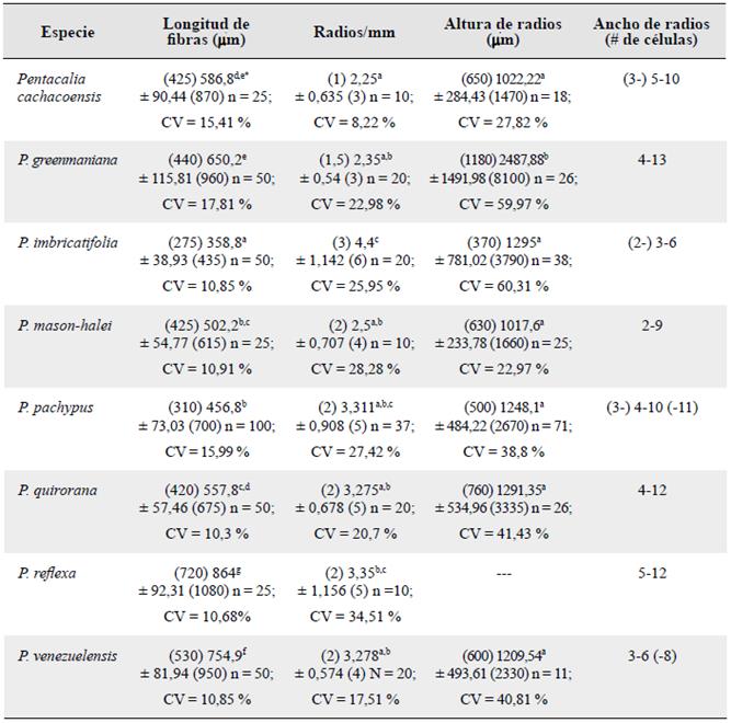 Tabla 3: Características cuantitativas de fibras (longitud de fibras) y radios (radios/mm, altura de radios, ancho de radios) para especies de Pentacalia: mínimo, promedio, desviación, máximo, número de mediciones, coeficiente de variación.