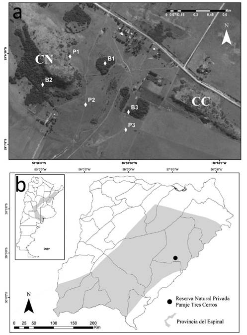 Este estudio se llevó a cabo en la Reserva Natural Privada Paraje Tres Cerros (RTC) (29°06' Sur, 56°55' Oeste), que se ubica en el centro-este de la provincia de Corrientes, Argentina. Comprende una superficie de 180 hectáreas. Los cerros que protege, Nazareno y Chico, presentan altitudes de 179 m y 148 m, respectivamente. Fitogeográficamente, la RTC se encuentra en la Provincia del Espinal (Cabrera 1971) (Fig. 1), la cual se caracteriza por la dominancia de especies arbóreas del género Prosopis, acompañadas por otros árboles de la Provincia Chaqueña (Cabrera 1971). La vegetación de la reserva comprende parches de bosques higrófilos con especies arbóreas como Ruprechtia laxiflora Meisn., Ficus luschnathiana (Miq.) Miq, Cupania vernalis Cambess. y pastizales con gramíneas de géneros como Andropogon, Aristida, Briza, Piptochaetium, Poa, Stipa, Paspalum y Panicum (Parodi 1943). Esta área protegida está inmersa en una región dominada por cultivos de arroz, forestaciones, y ganadería.