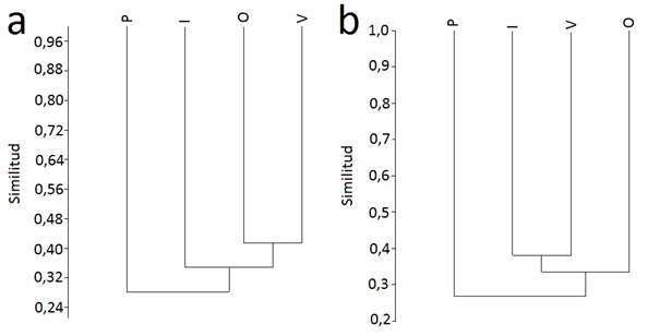 Figura 2: Similitudes estacionales con el índice de Jaccard de la comunidad de arañas de la Reserva Natural Privada Paraje Tres Cerros, Corrientes, Argentina. a. bosques, b. pastizales. V = verano, O = otoño, I = invierno, P = primavera.