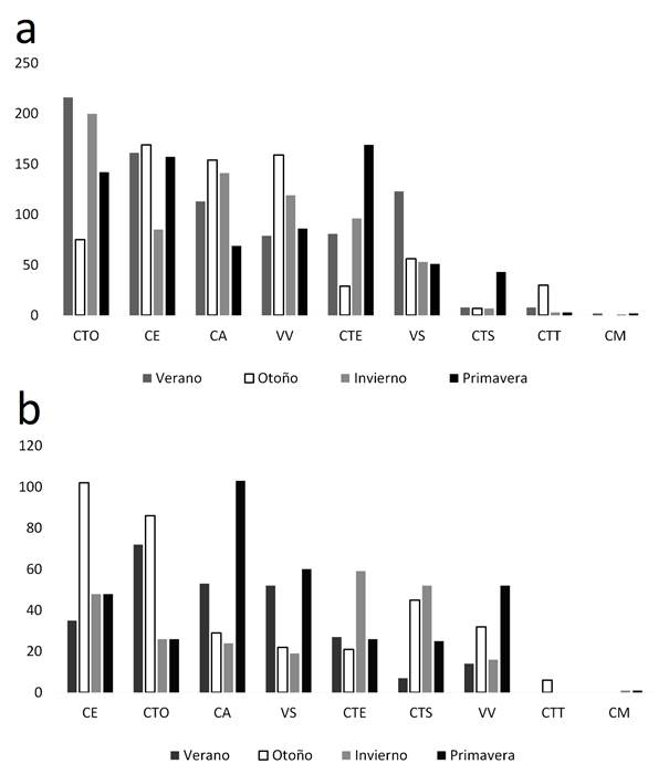 Figura 3: Abundancia de los gremios y variación estacional en la Reserva Natural Privada Paraje Tres Cerros, Corrientes, Argentina. a. bosques, b. pastizales. CA = Cazadoras al acecho, CE = Cazadoras por emboscada, CM = Constructoras de madriguera, CTE = Constructoras de telas espaciales, CTO = Constructoras de telas orbiculares, CTS = Constructoras de telas sabanas, CTT = Constructoras de telas tubulares, VS = Vagabundas de suelo, VV = Vagabundas de vegetación.