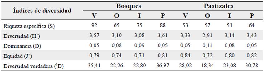 En los bosques, a excepción de la riqueza entre invierno y primavera, los valores de diversidad, riqueza y dominancia fueron significativamente diferentes en primavera y verano con respecto a otoño e invierno; la equidad solamente resultó diferente entre primavera y las estaciones frías (P < 0,05) (Tabla 1). En los pastizales no se observaron diferencias significativas en la riqueza (P > 0,05), mientras que los valores de diversidad y dominancia solamente fueron diferentes entre primavera y las estaciones frías y los valores de equidad entre otoño y las demás estaciones (P < 0,05). En relación con estudios que comparen índices de diversidad alfa por estación climática, en pastizales de clima templado los valores de diversidad (H’) mostraron un pico a mediados del verano; los de equidad no difirieron a lo largo de las estaciones (Hatley et al. 1980). Si bien los análisis de diversidad alfa no fueron discriminados por estación climática en una de las localidades estudiadas de la Provincia del Espinal por Avalos et al. (2009), ellos obtuvieron valores de diversidad similares a los obtenidos aquí para primavera y verano, los de dominancia resultaron altos con valores similares a los que aquí se obtienen para invierno y los de equidad, en cambio, resultaron muy bajos en relación a los obtenidos en cada estación en este estudio. Es preciso mencionar que los valores de diversidad aún pueden estar subestimados, sobre todo en los bosques, donde se recolectó el 63 % de las especies, debido a que estos asumen que todas las especies están representadas en la muestra (Magurran 2004).
