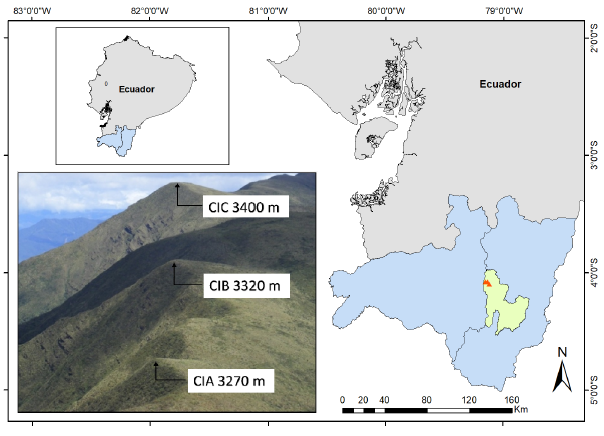 La investigación se llevó a cabo en tres cimas del páramo del Parque Nacional Podocarpus de la cordillera oriental de los Andes (PNP). La temperatura oscila diariamente entre 3 °C y 10 °C y con precipitaciones mínimas entre 2000 y 4000 mm, y con máximas de entre 5000 y 6000 mm. Las tres cimas ocupan una superficie aproximada de 6136,4 m2 y forman parte del proyecto de investigación: "Monitoreo a largo plazo del impacto del cambio climático en la biodiversidad de los ecosistemas de páramo del Parque Nacional Podocarpus (MICCAMBIO)" (Aguirre et al. 2015, Fig. 1).