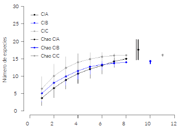 Figura 2: Curvas de acumulación y estimador de riqueza Chao 2 para cada una de las cimas (CIA = cima A, CIB = cima B, CIC = cima C).