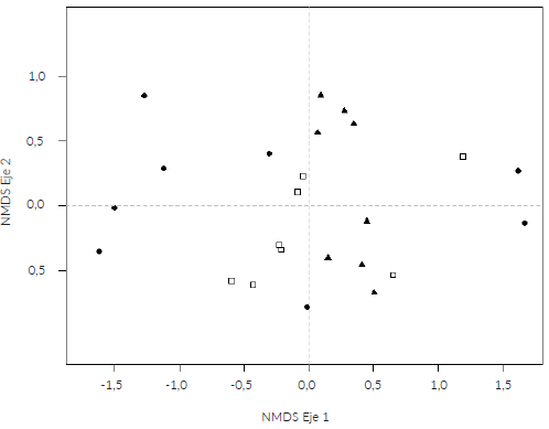 Figura 3: Análisis de escalamiento multidimensional no métrico (NMDS) de la composición de especies en las tres cimas. Cima A = círculos negros, cima B = cuadros blancos y cima C = triángulos negros.