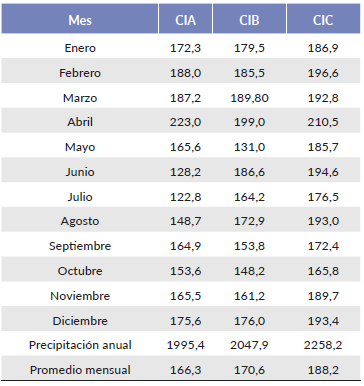 Tabla 1: Promedios mensual y anual de precipitación en cada una de las cimas en el año 2011. CIA = cima A, CIB = cima B, CIC = cima C.