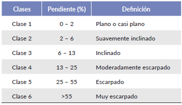 Los datos de temperatura y de precipitación fueron tomados de los 12 meses del año 2011. Los datos de precipitación se obtuvieron de pluviógrafos instalados en el punto cumbre de cada una de las tres cimas durante un año, con sensores HOBO (Onset Stowaway Tidbit) que registran datos de precipitación en intervalos de cinco minutos diarios (Tabla 1). La temperatura se registró por sensores (Onset Stowaway Tidbit) instalados en cada punto cardinal de las cimas (en total 12 sensores) con intervalos de una hora. La pendiente se midió utilizando un clinómetro en cada una de las direcciones cardinales de las cimas de la zona piloto y luego para su interpretación se utilizó una escala de clasificación en porcentaje (Tabla 2).