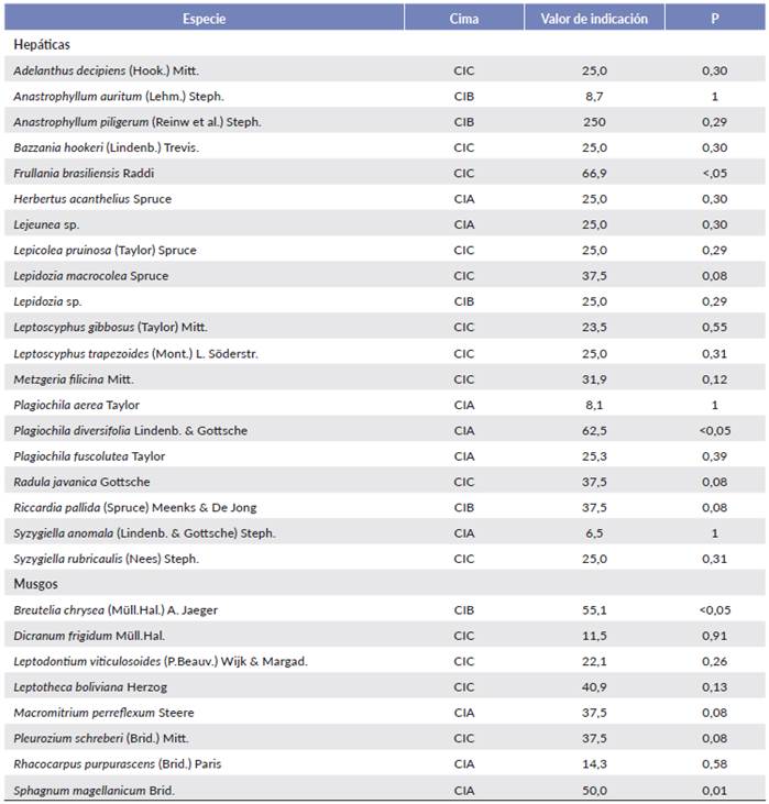 El MRPP mostró diferencias significativas en la composición de especies entre las tres cimas (A = 0,20, P < 0,001). Adicionalmente, la comparación entre pares señaló diferencias significativas (Tabla 5). El análisis de especies indicadoras (AEI) señaló que Plagiochila diversifolia Lindenb. & Gottsche presentó un alto valor de indicación para la CIA, así mismo, Breutelia chrysea (Müll. Hal.) A. Jaeger y Sphagnum magellanicum para la CIB (Tabla 3).