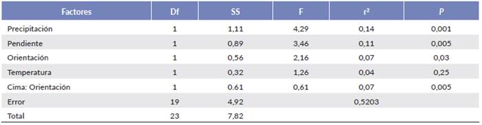 Tabla 4: Resultados del PERMANOVA de la composición de especies a nivel de cuadrante y los factores ambientales y topográficos. Df = Grados de ibertad; SS = suma de cuadrados; F = estadísticos F; P = nivel de significación; r2 = coeficiente de variación.