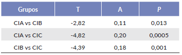 Tabla 5: Resultados de MRPP sobre la composición de especies a nive de cuadrante. T es el estadístico de prueba para el MRPP y p la probabilidad asociada a este. CIA = cima A, CIB = cima B, CIC = cima C.