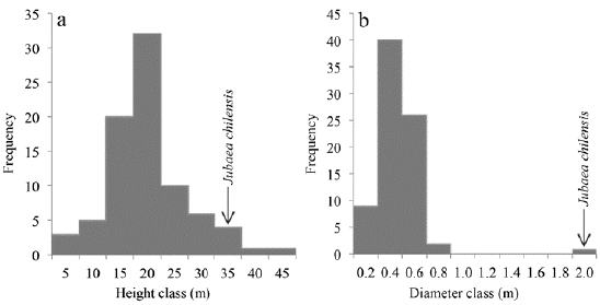 The LT-Tp category represents approximately 4% of all palm species in the world, but if we consider only the 789 species in the Americas, this rises to 13%. Considering the maximum heights for the species of the LT-Tp category (Fig. 2), J. chilensis is in the height class of 35 m which represents the percentile 98 (Fig. 2a) and in the diameter class of 2 m or percentile 100 (Fig. 2b). This gives the species the record for being the largest and most massive American palm, also confirming the description by Dransfield et al. (2008) as one of the most massive palm species in the world.