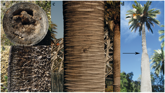 The Chilean palm has a massive and smooth trunk up to 33 m in height (Edwards 1903), and a diameter of between 0.43 to 2 m (Rubinstein 1969, Muñoz 1971). The trunk has a distinctive cylindrical shape with irregular swelling at or near the base and generally tapered toward the apex; unramified, dark gray, with a thinner part in the upper portion of the trunk in mature palms. Leaf scars can be distinguished for many years (Figs. 3a-c) (Rodríguez et al. 1983, Henderson et al. 1995). The thinnest part in mature individuals (Fig. 3d) is explained as a physiological variation produced after the first flowering and fruiting, which generates a loss of vegetative vigor and a reduction in meristematic activity in the apex (Rubinstein 1969, Senerman 1970). Consequently, the height at which the thinnest portion of the trunk begins indicates when the first flowering occurred, when the plant changed from the mature vegetative to mature reproductive stage. This happens when the plant is 10 to 13 m high and circa 40 years old (Rubinstein 1969).