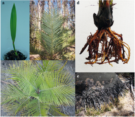 a. seedling single-leaf, b. adult leaf, c upper side view of a juvenile palm apex, d. six-year old palm root, e. adult palm root (Photo: Eduardo Guzmán).