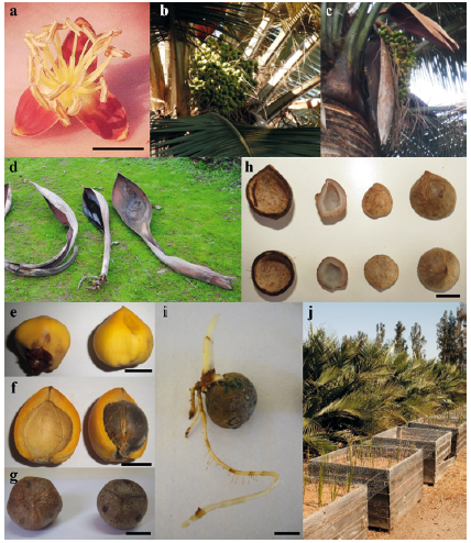 Figure 5: Chilean palm flower, fruits and seeds. a. staminate flower, b. racemes of fruit (Photo: Paulina Fernández), c. racemes of fruit protected by bracts, d. bract varieties, e. fruit, f. halved fruit showing the endocarp inside, g endocarp with pores, h. halved endocarp and internal seed, i. germinated seed, j. germination boxes from Oasis la Campana (Photo: Eduardo Guzmán). Scale bar = 1cm.