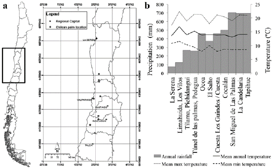 Figure 6: Natural distribution of Chilean palm populations. a. Chile territory and Chilean palm main locations, b. temperature and rainfall conditions of the natural distribution of the Chilean palm. Data sources: Santibáñez et al. 1990, 1993, Rioseco and Tesser c2014.