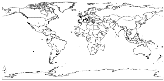 Figure 7: Map of Jubaea chilensis distribution around the world. Black dots indicate places where there are specimens of the species. As example, there are Chilean palms in cities in Australia (Intown 2014, Parsons c2013, Zona c2011), the USA (Fullerton Arboretum 2014, Goleta Valley Historical Society 2014, The Huntington c2014, Zona c2011), Spain (del Cañizo 2011, Plumed 2013, Sánchez 2011), France (Del Cañizo 2011, Dugand 1965, INRA 1998), Ireland (Kells Bay House and Gardens 2014), Italy (Plaumann 2001, Zona c2011), the Netherlands and Portugal (Zona c2011), the UK (Kew Royal Botanic Gardens 2014) and Russia (Nichols 2014).