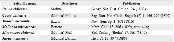 The species J. chilensis belongs to the subtribe Attaleinae, and with another ten genera to the tribe Cocoseae, subfamily Arecoideae, family Arecaceae and order Arecales (Baker and Dransfield 2016). Jubaea is a monotypic genus and the only genus endemic to the Pacific coast of South America (Pintaud and Ludeña 2008). It is named after King Juba II, who ruled Numidia between 85 and 46 BC, because of his great interest in botany (Muñoz-Schick et al. 2012). Table 1 shows the names given to this species and the authors that have described it, to the last accepted name: J. chilensis by Henri Ernest Baillon in 1895. There was a native palm species in Easter Island, now extinct, that botanists named Paschalococos disperta (Dransfield et al. 1984), which other authors added later to the Jubaea genus (Mieth and Bork 2010).