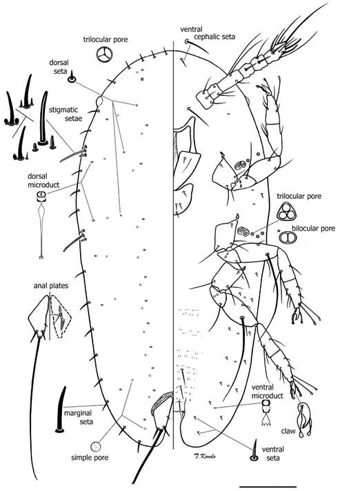 Diagnosis. Slide-mounted specimens (not illustrated). Adult female oval to elongate oval, with no distinct stigmatic clefts. Anal cleft rather short, about 1/8th of body length. Length 1.6-1.8 mm long, width 1.2-1.4 mm. Dorsal derm membranous. Dorsal setae minute, each only as long as wide, sparse. Dorsal pores round, with thick walls and small inner ductule; arranged along dorsal setae in a reticulate pattern on dorsum. Preopercular pores arranged in a small compact group of 14-19 pores present anterior of anal plates, with another small group of 11-19 pores dorsad to a point midway between antennal bases. Dorsal tubular ducts absent. Dorsal tubercles present submarginally, each convex and rather tall. Anal plates together quadrate, each plate with posterior margin longer than anterior margin, outer angle forming a right angle, with a large discal setae, which is either fimbriate or has a slightly bulbous distal apex, and three small apical setae. Anogenital fold with 6-8 setae present along anterior margin and three or four pairs laterally. Anal ring with about 6 setae. Marginal setae quite long, finely setose with pointed or fimbriate apex. Stigmatic clefts absent; stigmatic setae totaling 3 (rarely 2) per stigmatic area, median spine very long, spiniform and tapering, lateral spines usually spiniform, but frequently with one (usually the anterior) or both setiform and fimbriate. Eyespots present near margin. Ventral derm membranous. Pregenital pores each mainly with 10 loculi. Spiracular disc pores mainly with 5 loculi. Ventral microducts most abundant marginally when compared to mid areas. Ventral tubular ducts of about two types present: 1) a smallish duct with a filamentous inner ductule, rather sparse mediolaterally on abdomen and medially and mediolaterally on thorax; and 2) a similar duct but with inner ductule broader with a large terminal gland, frequent anterior to mouthparts. One or two long pairs of ventral setae present between antennae; also, with three pairs of long pregenital setae; small setae frequent laterally on abdomen and submarginally. Spiracles normal. Legs well developed, each with a small articulatory sclerosis; tarsal digitules slender; claw digitules similar, with broad apices. Antennae with 7 or 8 segments (adapted from Hodgson 1994).