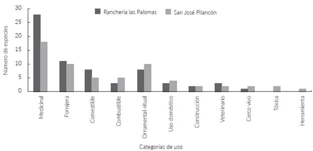 En los dos sitios el uso de especies se concentra en la categoría medicinal, RLP 42 % (28) y SJP 29 % (18), en concordancia con estudios de otros estados (Navarro y Avendaño 2002, Padilla 2007, Galván 2008, Bello-González et al. 2015). Es decir, que los habitantes tienen un mayor conocimiento sobre estas plantas, debido a que es un recurso fundamental y tradicional para el alivio de enfermedades comunes. Asimismo, son importantes para estos sitios remotos, ya que las poblaciones cuentan con un nivel de marginación alto y los servicios de salud son escasos o se encuentran en las cabeceras municipales. Para SJP, su municipio es Mariano Escobedo, el cual sólo cuenta con siete unidades de salud dispersas en las 47 localidades, pero ninguna está en SJP (Gheno-Heredia et al. 2011, Sotero-García et al. 2016, SEDESOL c2017).