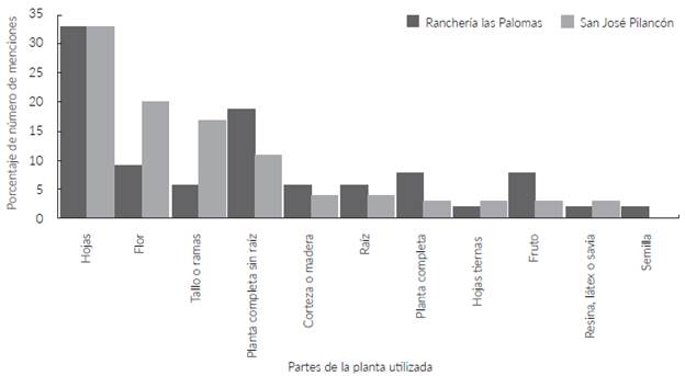Figura 3: Porcentajes de las menciones para cada parte de la planta utilizada por los habitantes de Ranchería Las Palomas y San José Pilancón.