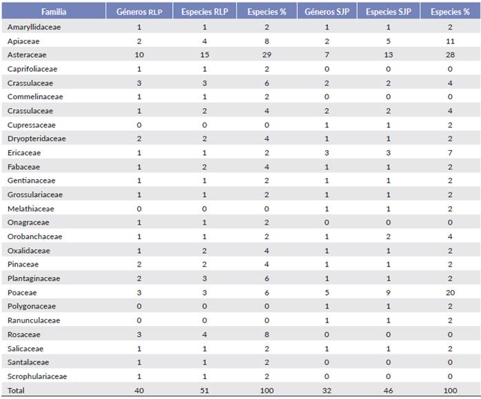Mientras tanto, en SJP se encontraron 18 familias, 32 géneros y 46 especies útiles. Las familias mejor representadas fueron Asteraceae 28 %, Poaceae 20 % y Apiaceae 11 % (Tabla 1). Entre los géneros con mayor número de especies están Pseudognaphalium (dos), Gnaphalium (dos) y Echeveria (dos), además la mayoría de las plantas son herbáceas con el 74 % (34), seguido de arbustivas 17 % (ocho), árboles 7 % (tres) y por último rastreras 2 % (uno).